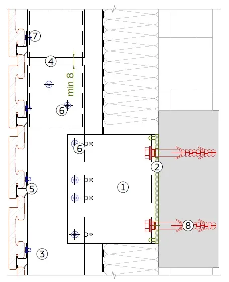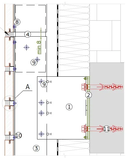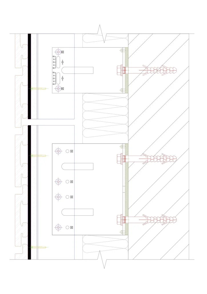 Brackets with preassembled isolators reduce thermal bridging by separating the substructure from the base wall, enhancing the building’s thermal efficiency. Each bracket includes two fixing points: fixed and sliding. Fixed points support the weight of the cladding and window loads, while sliding points compensate for thermal expansion. Both are clearly marked to prevent mounting errors.